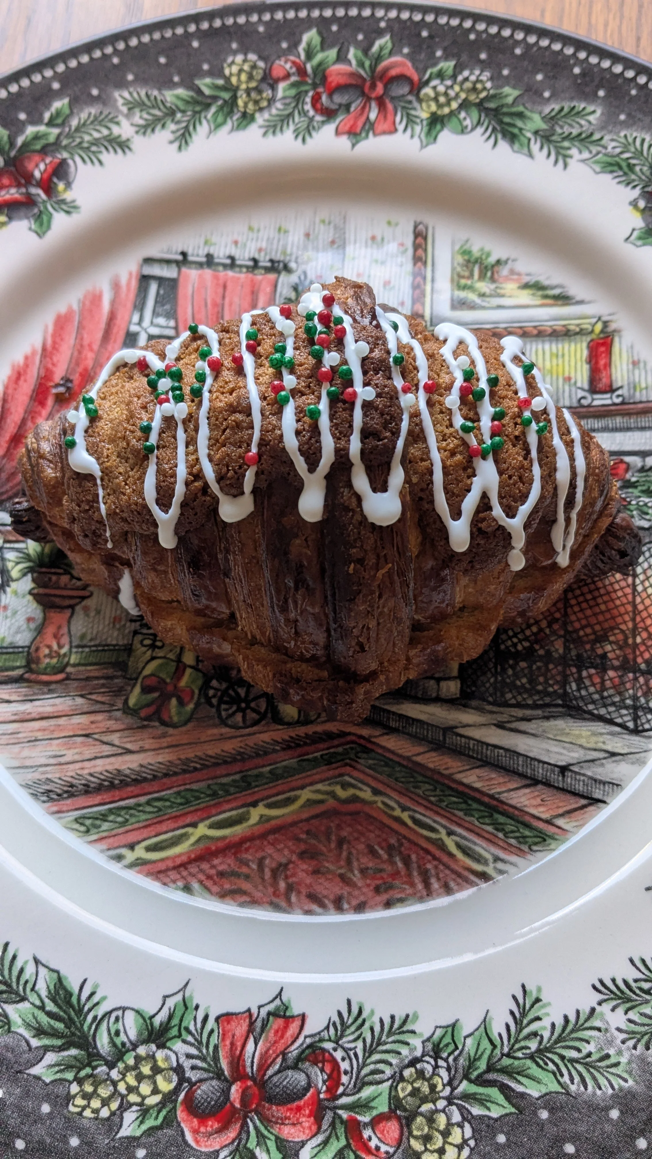 A whole wheat Peace Country Croissant gets filled with our proprietary spiced gingerbread frangipane and topped with royal icing and sprinkles. Supplies for this are EXTREMELY limited, so act fast and don't hesitate!